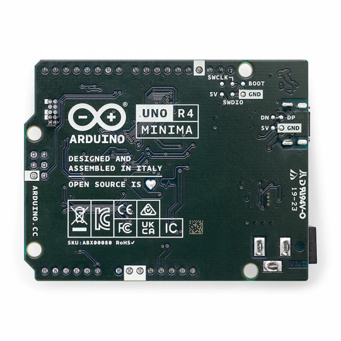 - Compatibilitate hardware cu form-factorul UNO: UNO R4 Minima păstrează același form-factor, configurație de pini și tensiune de alimentare de 5 V ca predecesorul său, UNO R3. Acest lucru asigură o tranziție fără probleme pentru shield-urile și proiectele existente, profitând de ecosistemul extins și unic deja stabilit pentru Arduino UNO.