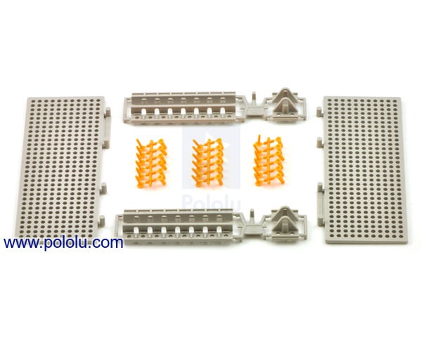 Acest set include două plăci de plastic cu o grilă de 11 x 31 cu găuri de 3 mm distanțate la 5 mm, care oferă spațiu pentru multe conexiuni mecanice. Cele patru suporturi unghiulare cu opt găuri incluse pot conecta cele două plăci și plăci universale suplimentare sau pot servi ca punct de montare pentru o osie. Setul de plăci include, de asemenea, patru suporturi de arbore (suporturile triunghiulare din imaginea de mai sus) pentru axele de susținere. Setul oferă 18 nituri de împingere pentru conectarea colțurilor și suporturilor arborelui la plăci.